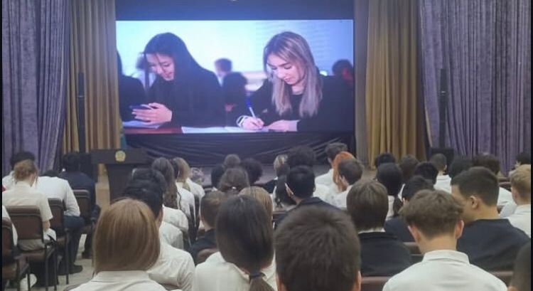 Almaty management college (МАБ колледжі) оқытушыларының 9-сынып оқушыларымен кездесуі. Встреча преподавателей Almaty management college (колледж МАБ) с учащимися 9-х классов.